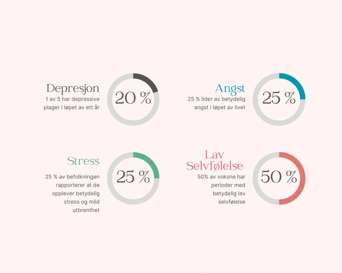 • Skreddersydd for vanlige psykiske helseplagene: Dette tilbudet er spesialisert for å hjelpe mennesker med vanlige psykiske helseutfordringene som angst, depresjon, stress og lav selvfølelse. I motsetning til generelle behandlingstilbud som kan favne bredere, fokuserer dette tilbudet utelukkende på de mest vanlige plagene mange mennesker sliter med i hverdagen. Denne spesialiseringen gjør det mulig å bruke skreddersydde teknikker og metoder som er nøye tilpasset disse problemene, slik at du får en mer presis og målrettet behandling.